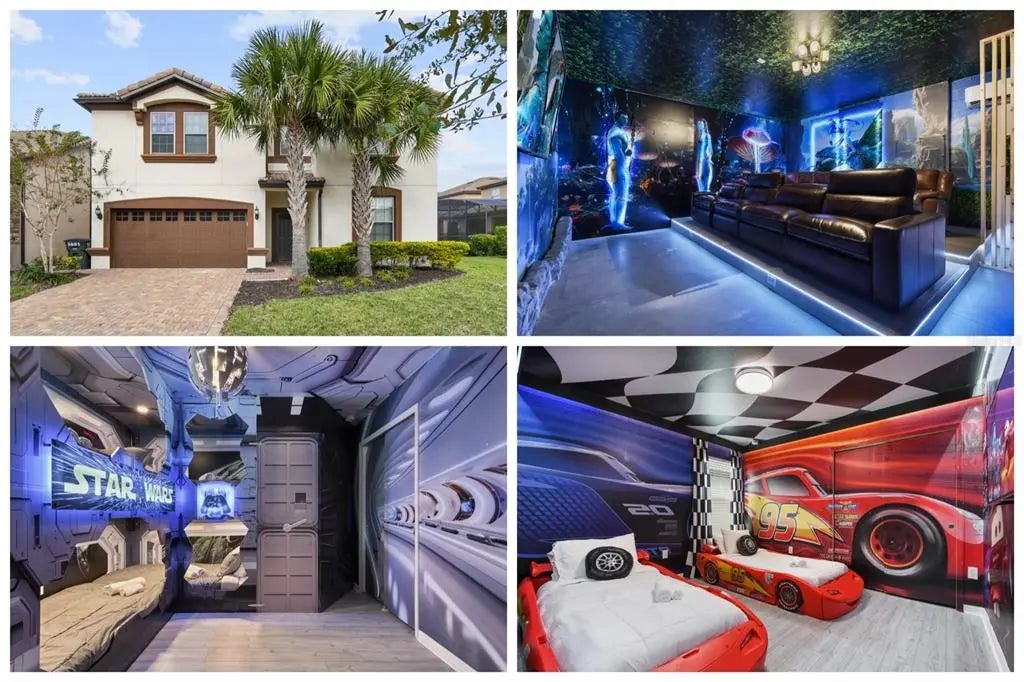 Enjoy the Florida lifestyle with your private screened-in pool and hot tub overlooking the pond. This home has been thoughtfully upgraded to enhance the guest experience, including: *Luxury vinyl plank flooring throughout (no carpet)*, *Garage converted into an Avatar-themed movie theater, Custom-designed Star Wars-themed bedroom and loft game room*, *Four additional themed bedrooms inspired by Harry Potter, Alice in Wonderland, Cars, and Minions*, *All other bedrooms are tastefully decorated with quality furnishings and stylish accents to appeal to a wide range of guests!*