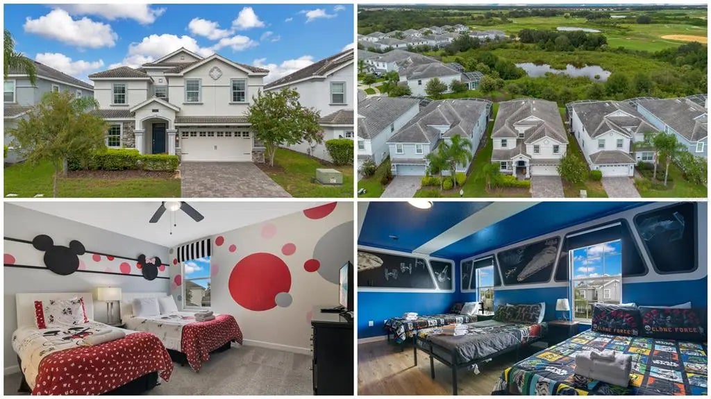 Under contract-accepting backup offers. Priced to sell! Enjoy serene conservation views from your private pool in this expansive 8-bedroom, 5-bathroom retreat, complete with a large media room that doubles as a 9th bedroom. Nestled in the highly sought-after Retreat at ChampionsGate with no rear neighbors, this beautifully furnished home offers a rare opportunity for both investors and vacation homeowners. Inside, the bright open floor plan showcases a fully equipped kitchen with modern finishes, multiple living areas, and spacious bedrooms designed for comfort and style. The main floor includes a luxurious primary suite and an additional guest bedroom—ideal for multigenerational stays. Upstairs, the large loft has been transformed into a cozy home theater, while the converted media room provides extra sleeping space with a Star Wars theme and three beds. Other themed bedrooms, including Harry Potter and Mickey Mouse, delight guests of all ages. Entertainment abounds with a game room featuring a pool table, foosball, and air hockey. Step outside to a private screened-in lanai with an oversized heated pool and spa, complete with a child safety fence. With no rear neighbors, you’ll enjoy enhanced privacy and tranquil views. Located in a gated, resort-style community with 24-hour security and world-class amenities—clubhouse, fitness center, water park, tennis courts, and golf course—this property is just minutes from Disney, shopping, dining, and major highways. Perfect as a high-performing short-term rental or your own vacation retreat!