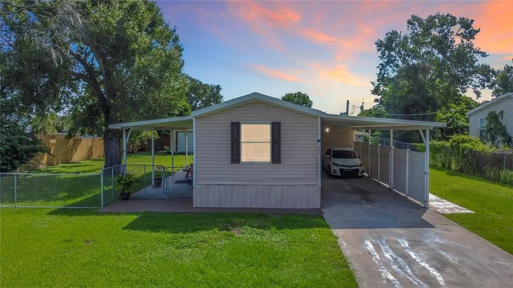 Tucked in the established Country Green area, this move-in ready 2005 manufactured home sits on a quarter-acre (approx. 85’ x 132’) lot and features a covered carport 39'8" x 12'1" plus a detached garage—perfect for extra storage, hobbies, or a workshop. Inside you’ll find easy single-level living with tile floors throughout, an open living/dining area, and a kitchen with good prep space. The split layout includes a spacious primary bedroom (14'0" x 13'11") with an en-suite bath, a generous second bedroom (10'6" x 13'11"), and a third room (5'0" x 8'0") ideal for a nursery or home office. A flexible bonus room (11'11" x 12'1") off the carport adds great utility for a gym, studio, or playroom. Outside, enjoy the fully fenced yard, shade trees, and covered porches—perfect for pets, play, and weekend projects. Fantastic location close to restaurants, supermarkets, Downtown Kissimmee, and Kissimmee Gateway Airport with quick access to US-192, John Young Pkwy, and the Turnpike. Public records indicate 3 beds/2 baths and 924 sf; buyer to verify all measurements, room count, and uses shown on the floor plan. Flood Zone X per FEMA (generally outside special flood-hazard areas). Come see it today! all measurements are approximate.